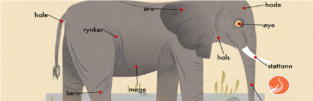 Først så starter man opp med et oversiktsbilde med de fire forskjellige dyrene. Barna kan så trykke på hver og en av dem, for å få ny interaktivitet. Elefanten får for eksempel opp et display som viser hva de ulike delene på kroppen heter, og alt er på norsk!