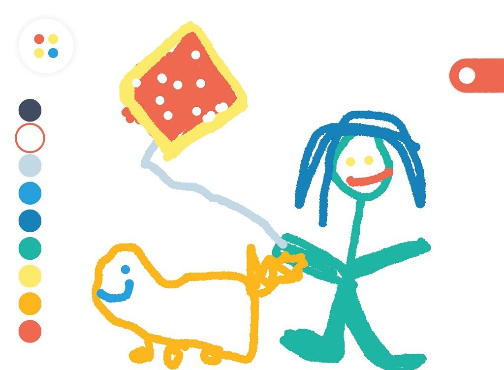 Hvert ikon leder altså til et spesifikt program. Her er det et lerret som barna kan tegne på ved å føre fingeren eller en iPad-penn. Verktøylinjen er oversiktlig og grei for små barn å forholde seg til. Det er ikke noe massivt utvalg av pensler, kun farger og en viskefunksjon.