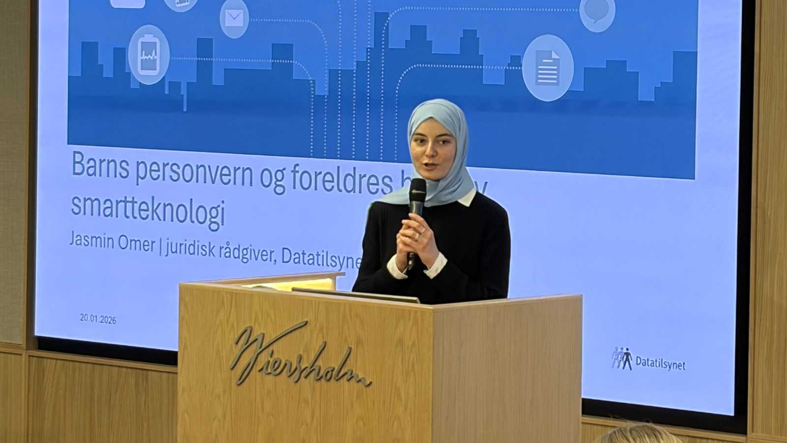 Hva skjer på lang sikt? Dette spørsmålet stilte Jasmin Omer som er juridisk rådgiver i Datatilsynet (bildet over). Det er en risiko for at hvis foreldrene overvåker barna tungt, vil barna oppfatte dette som normalt og ta med seg den holdningen videre til arbeidslivet og andre steder og godta tung overvåking der samt overvåking fra kommersielle aktører.