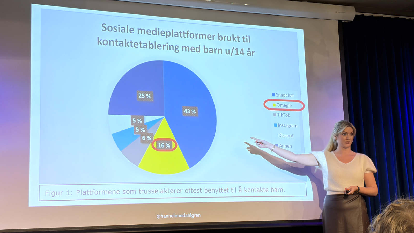 Først fikk mamma og influenser Hanne-Lene Dahlgren holde et innlegg. Hun viste hvor lett det var på skolemaskinen å få videokontakt med fremmede som drev med upassende aktiviteter for barn.