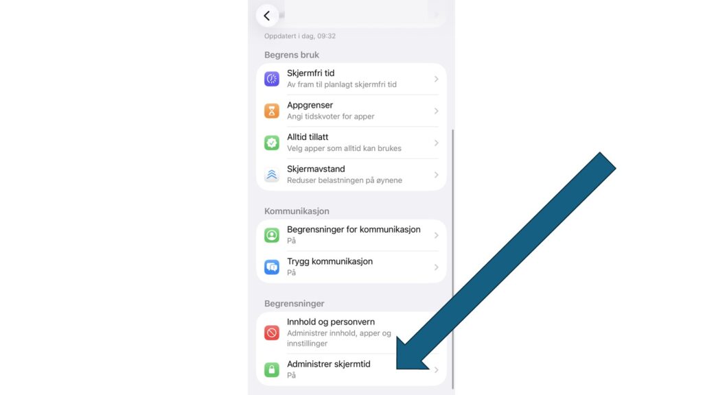 Det er altså funksjonen som heter Skjermtid som samler alle nyttige foreldreinnstillinger på ett og samme sted. For å finne frem til skjermtid, må man åpne opp innstillinger og sveipe ned for å gå inn på Skjermtid. Menyvalgene nå varierer noe avhengig om dette er på forelderens eller barnets/ungdommens ipad/iphone.