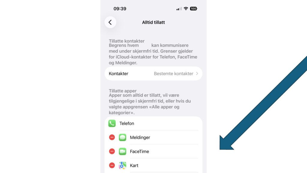 Alltid tillatt: Dette er apper, tjenester og kontakter som alltid er tillatt, også i skjermfri tid og utover tidsgrenser du har satt. Her kan du legge til eller fjerne apper i en tillatt-liste etter eget ønske. Man kan også velge hvem barnet kan kommunisere med under skjermfri tid. Velger man bestemte kontakter, så kan man lage en liste som inneholder kun foreldre, besteforeldre, søsken og så videre.