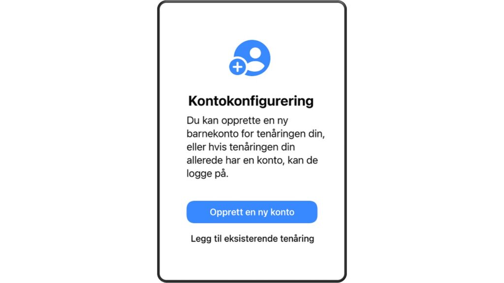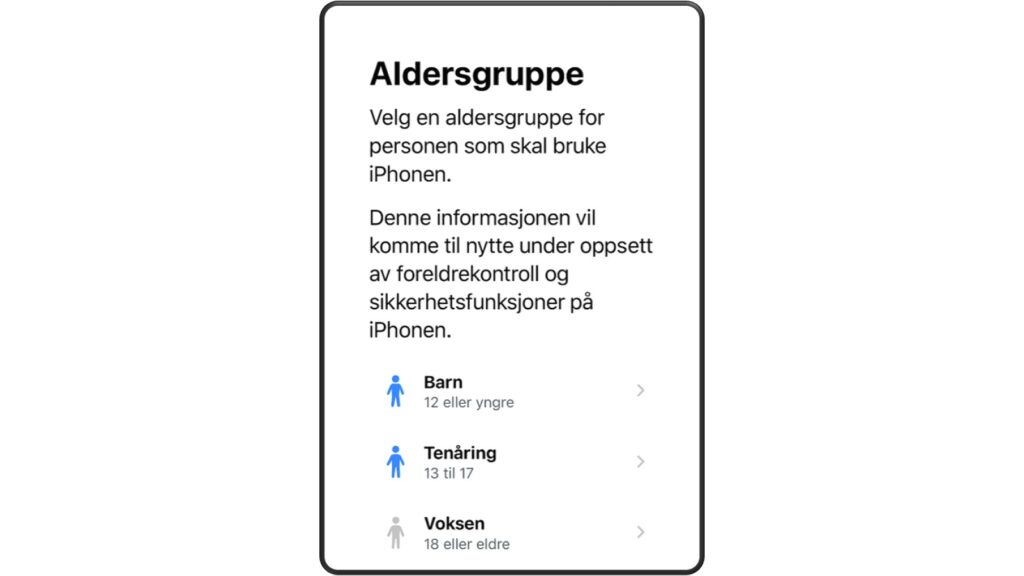 - Første gang man slår på en ny Apple-enhet får man beskjed om å velge om man er barn, ungdom eller voksen og så logge inn med eller opprette en Apple ID.