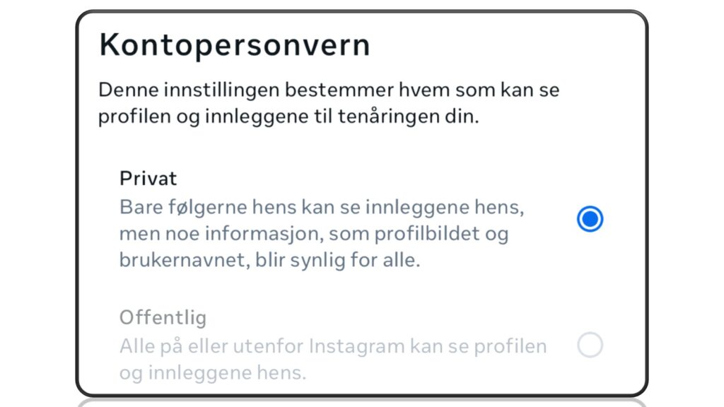 - Privat profil, og de kan ikke gjøre denne offentlig uten foreldres tillatelse. Det betyr at tenåringen må godta nye følgere. Og folk som ikke følger dem, kan ikke se innholdet.