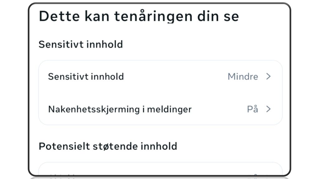 - Hvor strengt innholdsfiltreringen er satt til (filtreringen av sensitivt innhold) og om nakenbilder i meldinger blir sensurert.