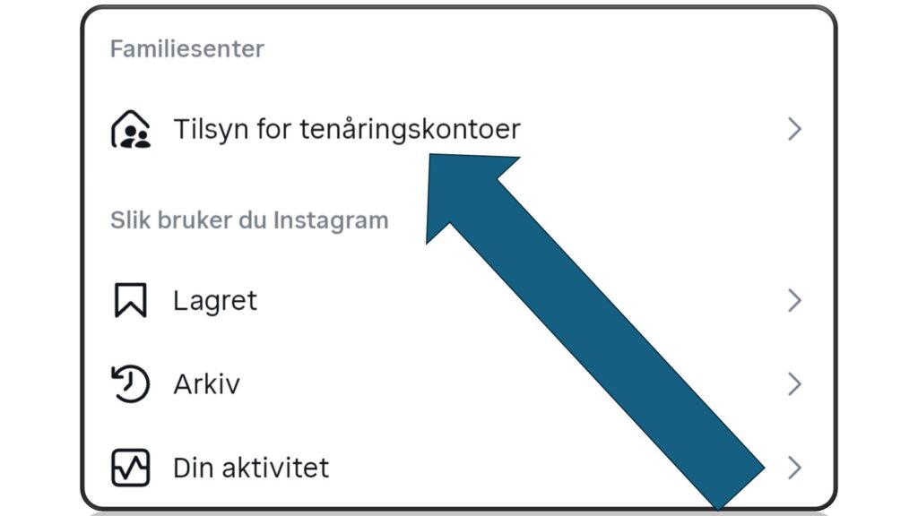 På forelderens Instagram-konto er det en egen meny inne i innstillinger som heter «tilsyn for tenåringskontoer». Tenåringen vil nå dukke opp her. Dette er ikke en ny funksjon hos Instagram, for denne har vært på plass tidligere.