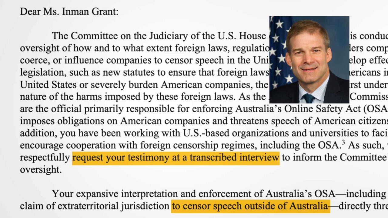 Jim Jordan, som er leder for leder for justiskomiteen i USA (bildet øverst), mener de australske reglene hindrer ytringsfriheten til amerikanere. For i fjor ba Grant om at X skulle slette en voldsscene fra en kirke i Sydney. X mente at det burde holde at selskapet blokkerte videoen fra nettet i Australia, men advokatene til Grant sa at folk lett kunne komme rundt blokkeringen ved hjelp av VPN. Argumentasjonen la altså opp til at videoen måtte slettes globalt. Og det er å gå for langt, mener Jim Jordan, og har bedt Grant vitne for den amerikanske justiskomiteen. Hvis det skulle bli noe av, vil det antagelig skje via skjerm og ikke fysisk oppmøte.