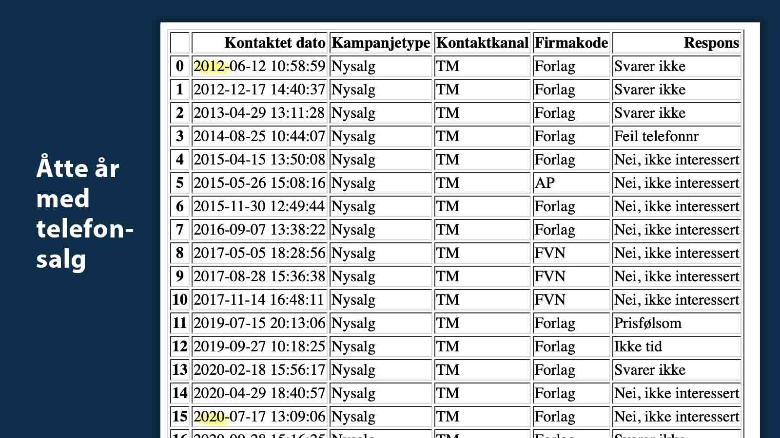 Barnevaktens medarbeider fikk også tilsendt flere tabeller over hvilke forsøk på telefonsalg som har blitt utført fra ulike avdelinger i Schibsted, statistikken gikk tilbake til 2012, med korte konklusjoner over hvorfor det ikke ble noe handel i hvert forsøk. Her er en av tabellene: