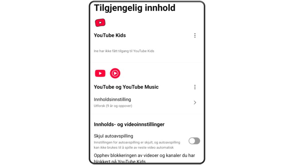 - Ubegrenset (most of Youtube): utelukker kun innhold ment for 18+. Kommentarfelt er synlige for barna i denne kategorien, men de kan ikke skrive selv.