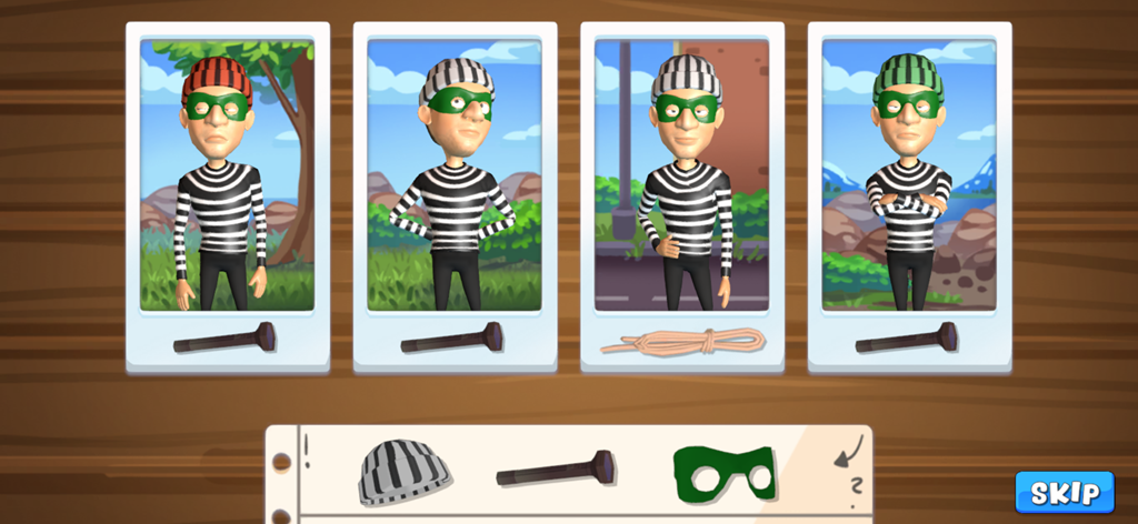 Til slutt har man samlet nok ledetråder til å identifisere riktig tyv. Hvilken farge har luen og masken? Har tyven tau eller hammer?