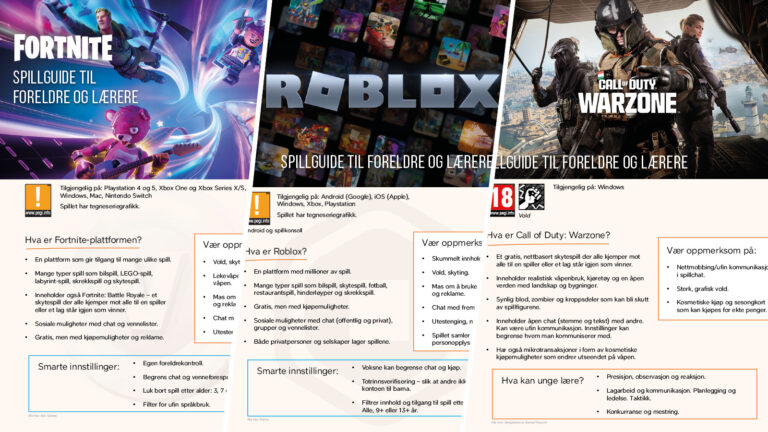 åpne ressursOversiktlige PDF-er med informasjon, råd og samtalespørsmål om noen av de mest populære spillene blant barn og unge.
