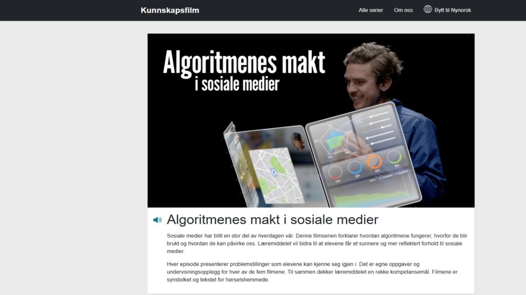 Algoritmenes makt i sosiale medier består av fem filmer (på 8-10 minutter hver) med tilhørende oppgaver. Læremiddelet vil gi elevene kunnskap om den utbredte bruken av sosiale medier og hvilke konsekvenser det kan ha på enkeltindividet og samfunnet. Læremiddelet vil bidra til at elevene får et sunnere og mer reflektert forhold til sosiale medier.
